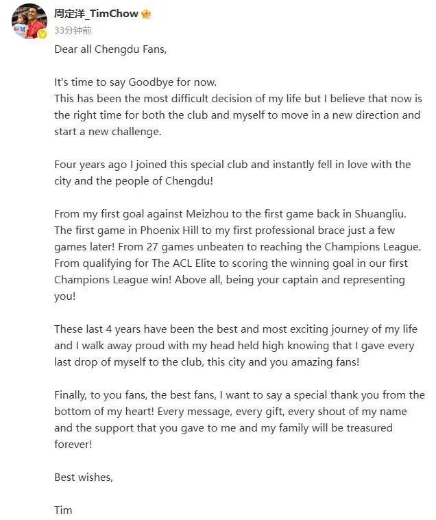 必发下载-中超转会动态:周定洋发文告别成都蓉城,已与保级队完成签约